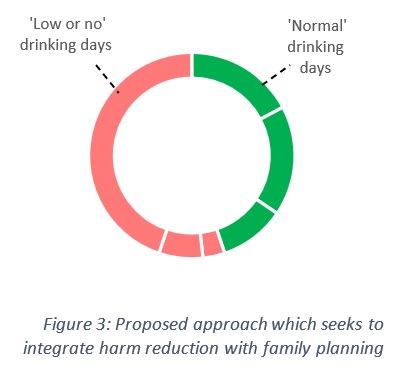 Figure 3 demonstrates an alternative to abstinence, whereby women could opt to have ‘normal drinking’ days from the first day of their period to ovulation, and adopt ‘low or no drinking’ days from ovulation to the first day of their next period (or until they confirm that they are not pregnant). Rather than 28 days of every month not drinking, this integrated alcohol harm reduction and family planning approach would translate into a hypothetical 13 out of 28 days as normal drinking days, and 15 out of 28 days as low or no drinking days.